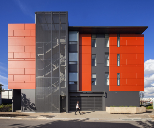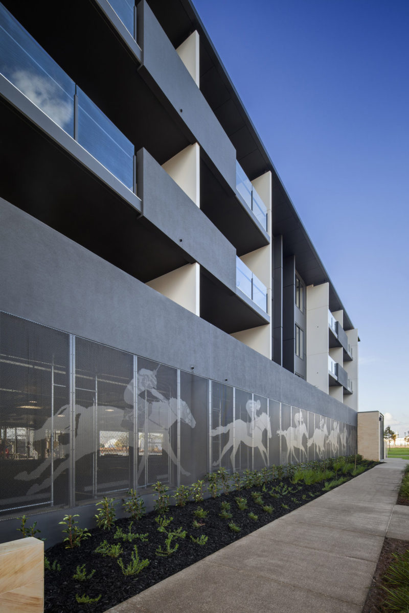 Located on a major boulevard within the St Clair development, the Cheltenham also fronts onto St Clair’s central park space. The project makes a valuable contribution to the urban identity of the precinct by incorporating different compositions and materials to address each unique frontage. The relationship to its adjacent lower-scale neighbours and incorporation of public artwork in the main façade that makes reference to the previous land use as a racecourse strengthens the development as a pivotal entrance site.