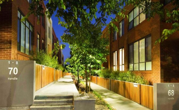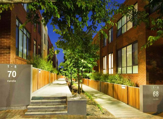 Two large buildings each containing eight terrace style dwellings, face a central landscaped pedestrian space, which has a strong link to Rundle Street. Vehicle access to each building is via a single timber clad door, which is integrated into the building street façade.